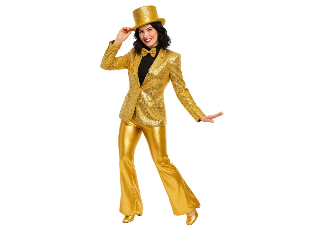 Kostým obsahuje: Zlaté sako, zlaté zvony, klobouk